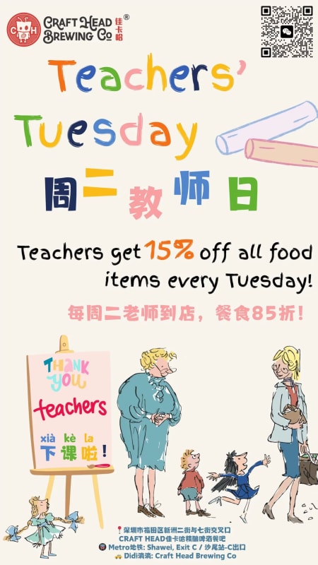 Calling all teachers, coaches, and professors! Join us at Craft Head for Teachers on Tuesday, a weekly celebration of your tireless dedication to shaping minds! Every Tuesday from 12:00 PM to 10:00 PM, enjoy 15% off your entire food bill.
