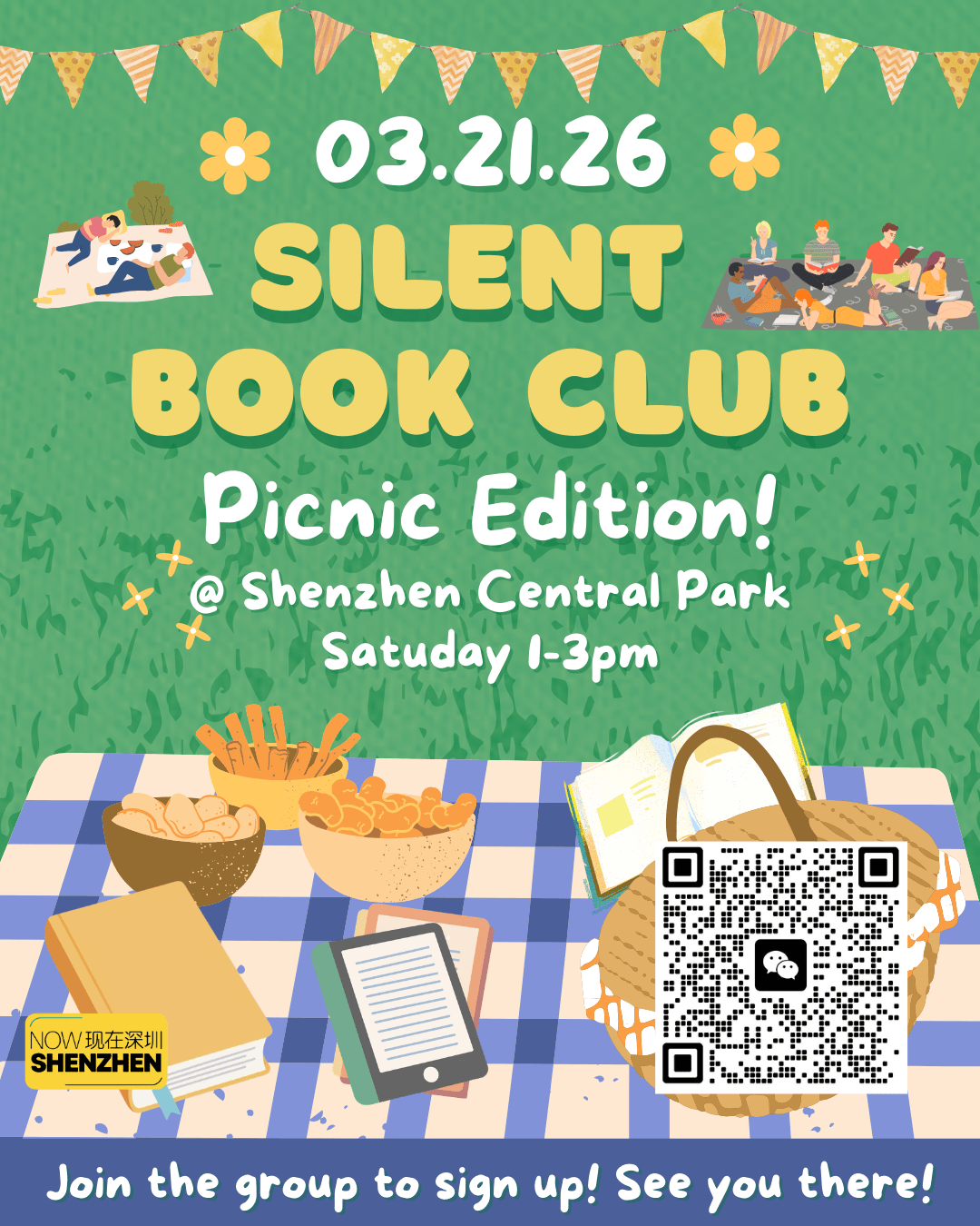 Shenzhen has not yet decided that it wants to be summer, so we’re taking the opportunity to take Silent Book Club outside: picnic edition!!!